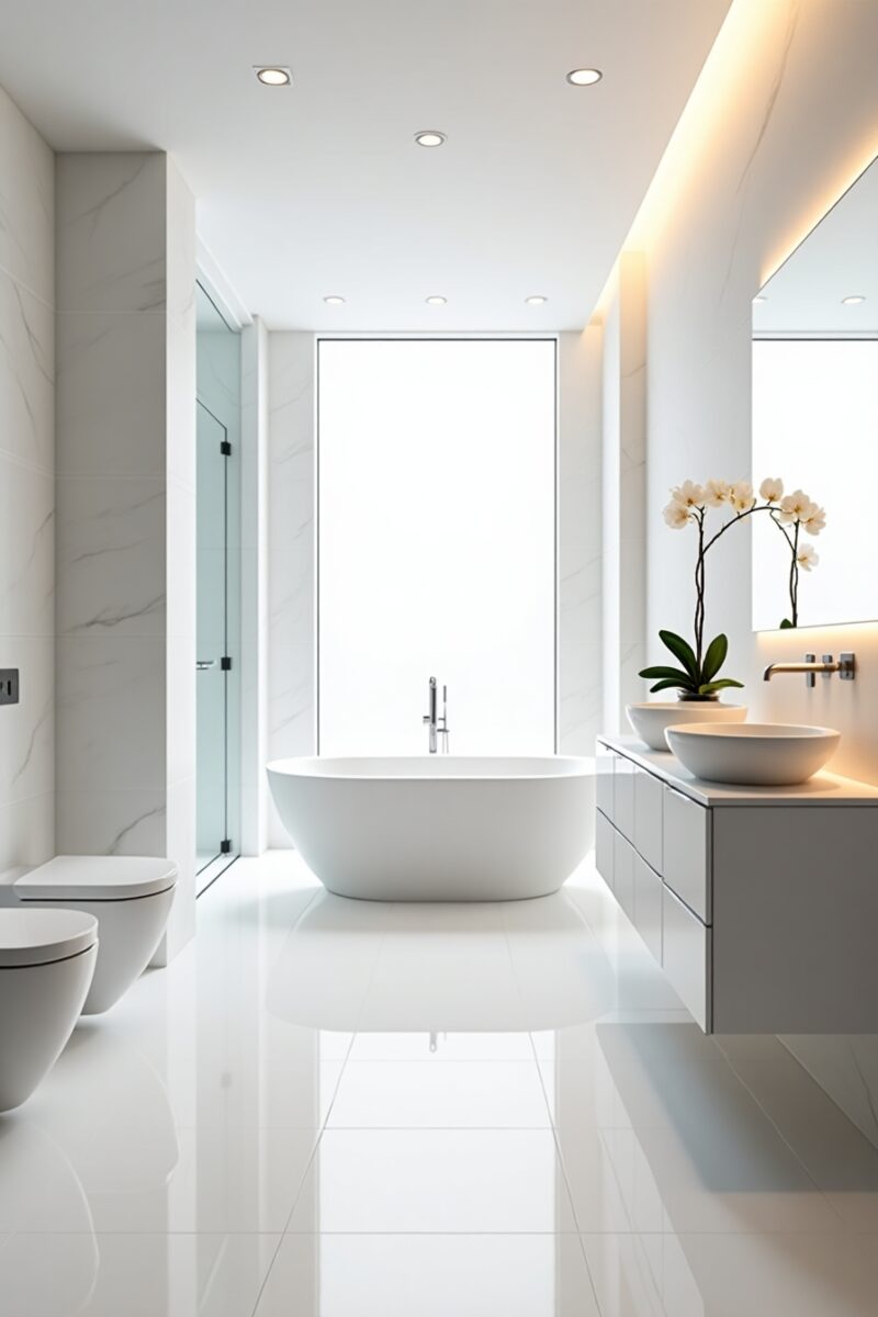 Potted orchids or small green plants provide just enough color to make the white surfaces pop without overwhelming the serene palette.