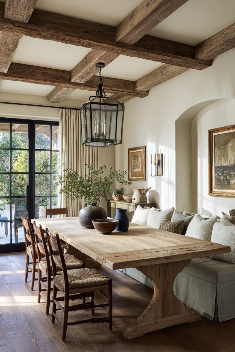 Your wood elements become the foundation that anchors all the other design choices in your Nancy Meyers-inspired dining room.