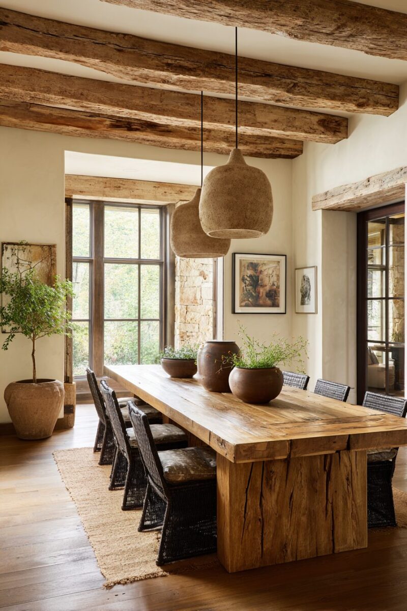 Your dining room needs the grounding influence of natural wood to create that authentic, lived-in luxury that defines Nancy Meyers interiors.