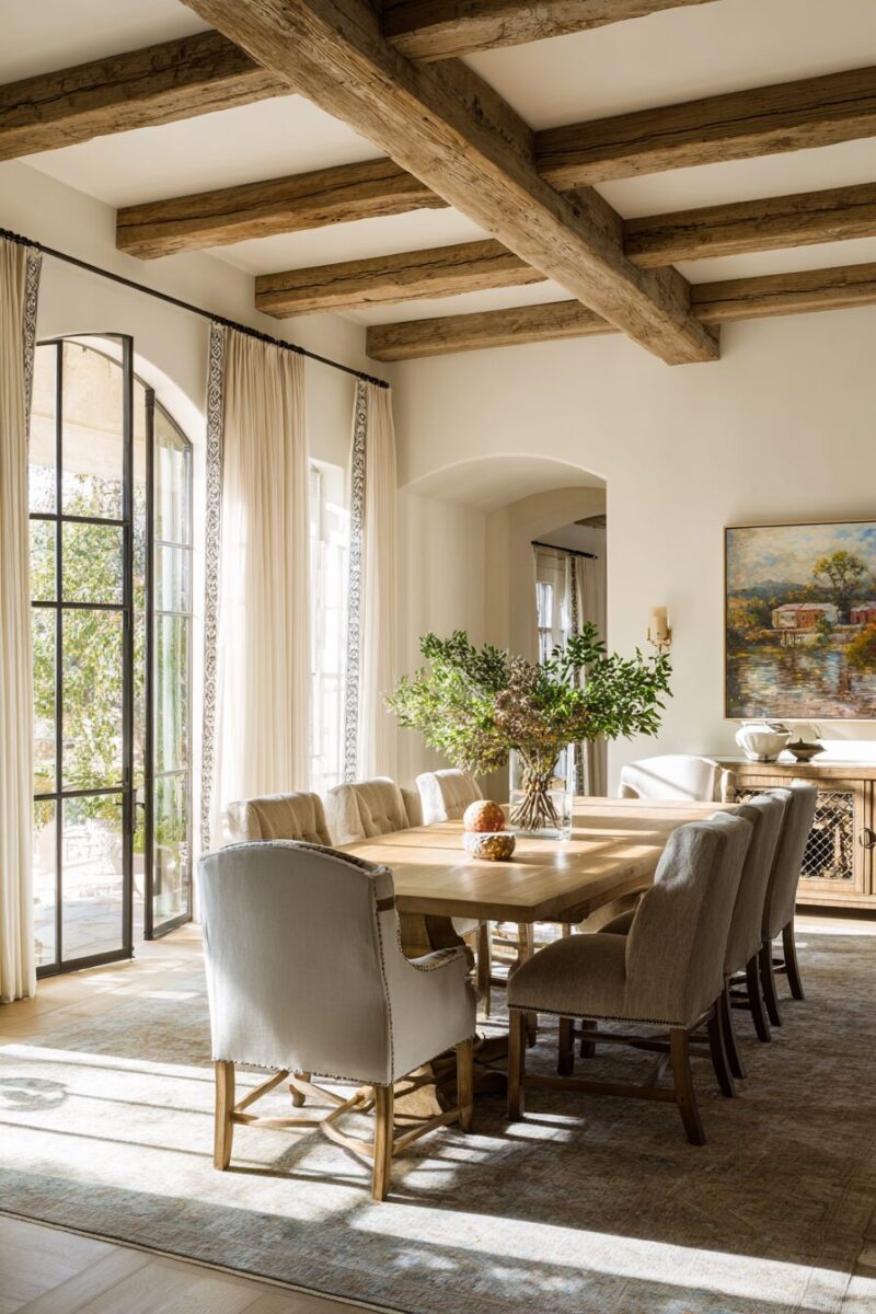 Wood ceiling beams, even if they’re decorative rather than structural, add architectural interest and help define the dining area within an open floor plan.
