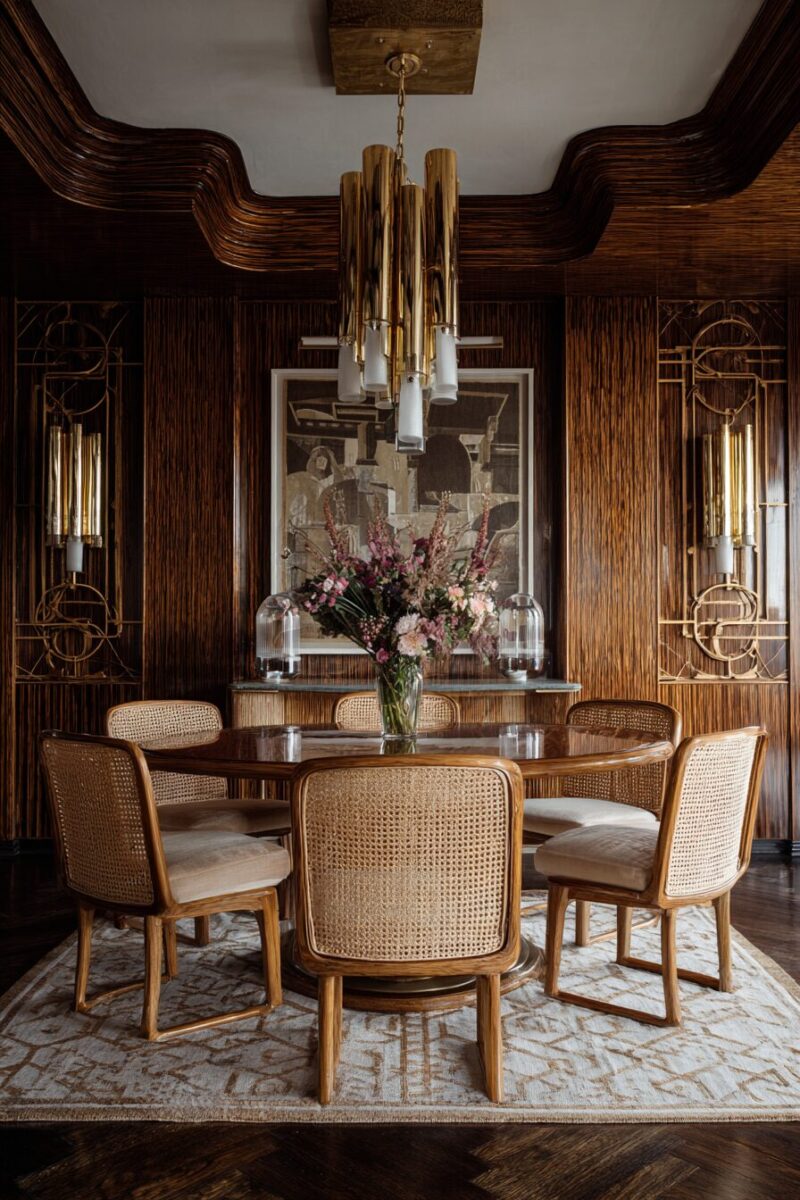 You can incorporate wood through your dining table, chairs, floating shelves, or architectural details like ceiling beams or wainscoting.
