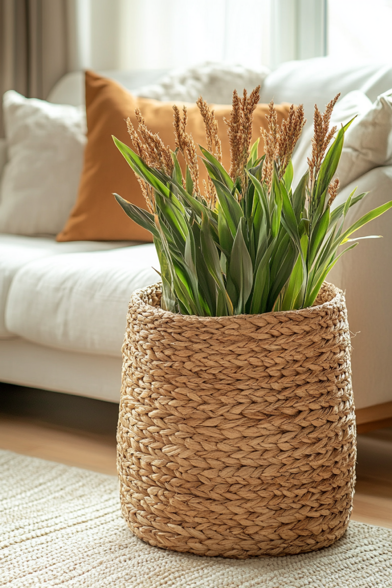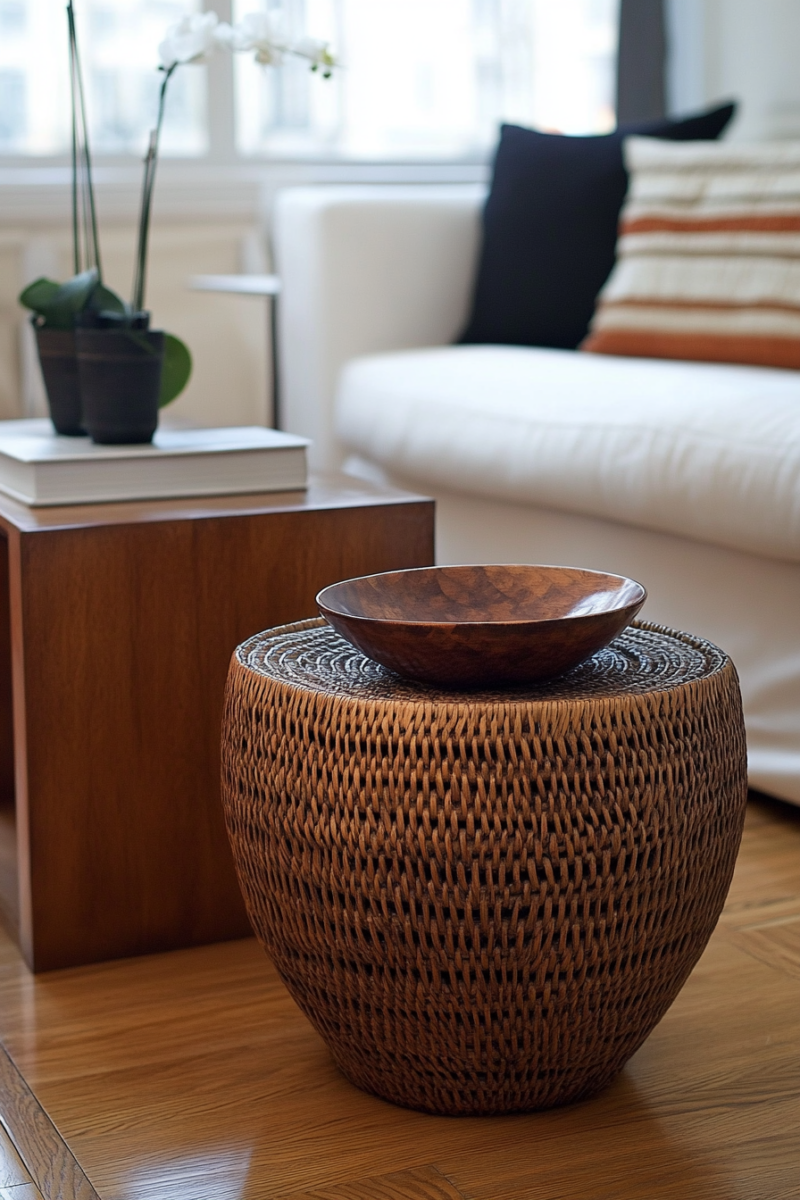 Incorporate natural elements like a woven basket in the corner or a rattan side table.