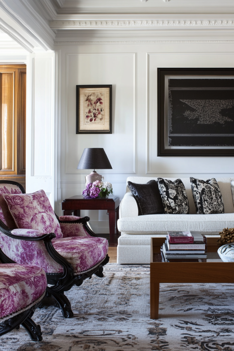 Choose sofas and chairs with timeless, ornate shapes as opposed to modern, boxy profiles.