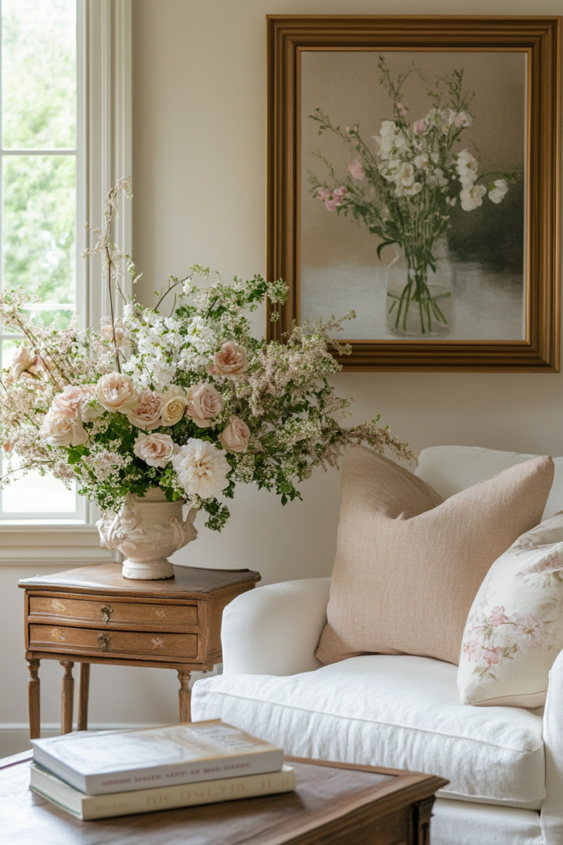 Nancy Meyers’ living rooms always feel alive, and a big part of that comes from the use of fresh flowers and greenery.