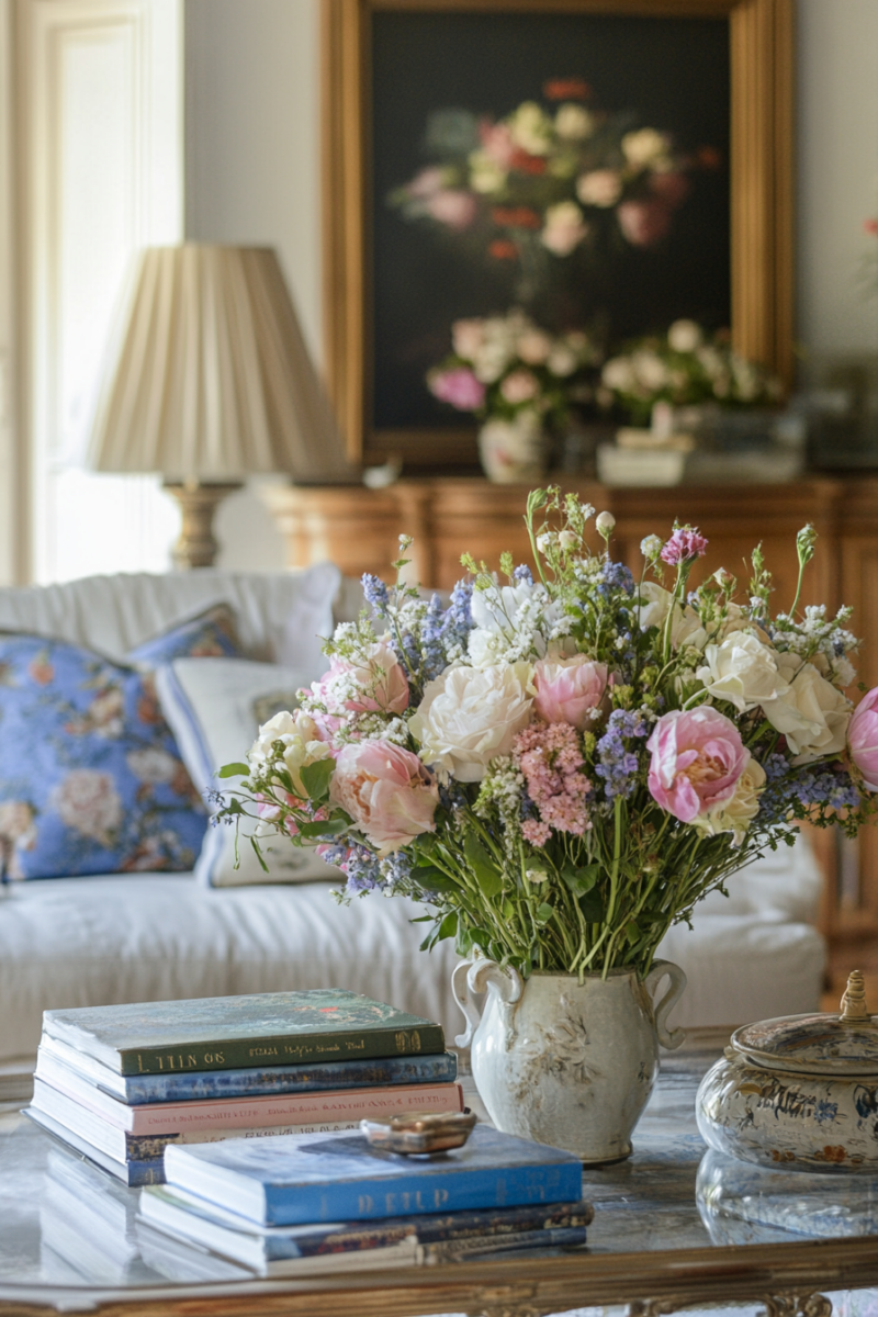 Keep things simple and elegant with a mix of coffee table books, a small vase of fresh flowers, and perhaps a candle or two.