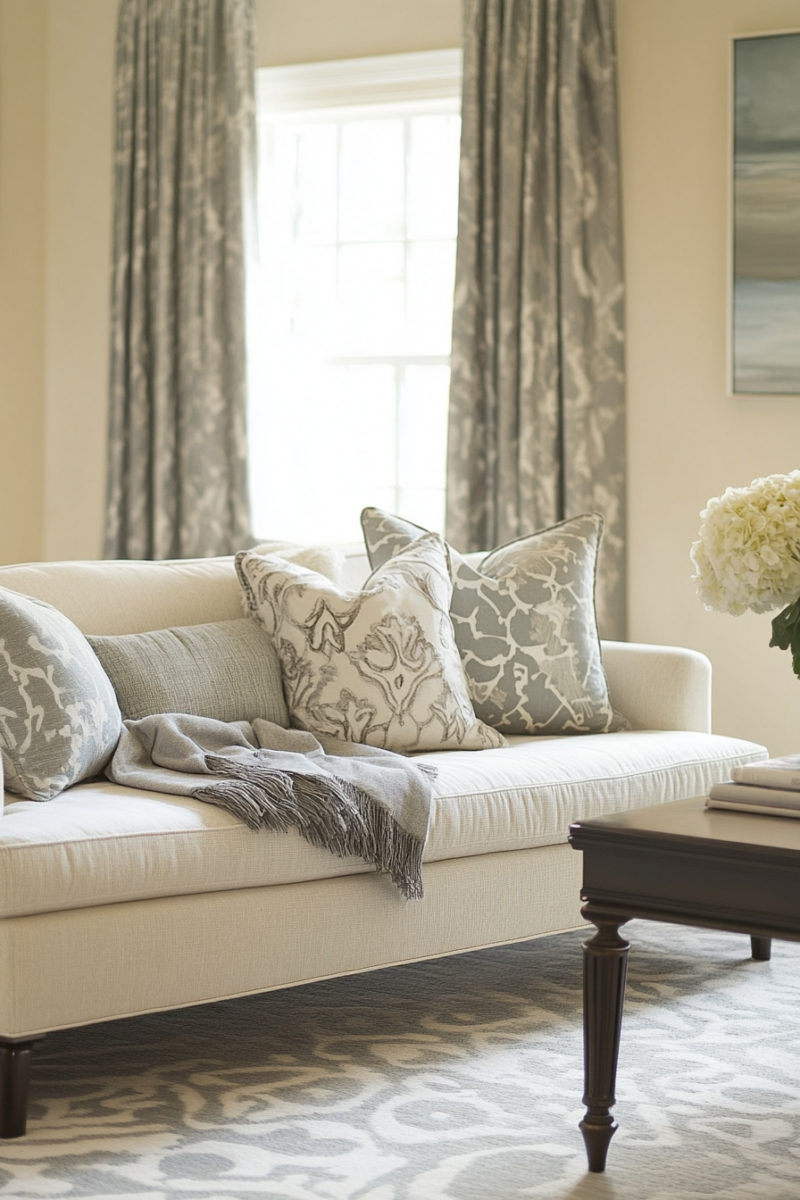 Choose pillows in various sizes, mixing solid neutrals with subtle patterns like stripes or small florals.