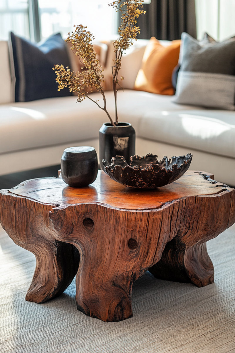 Look for furniture with exposed wood legs or a coffee table with a warm, rich finish.