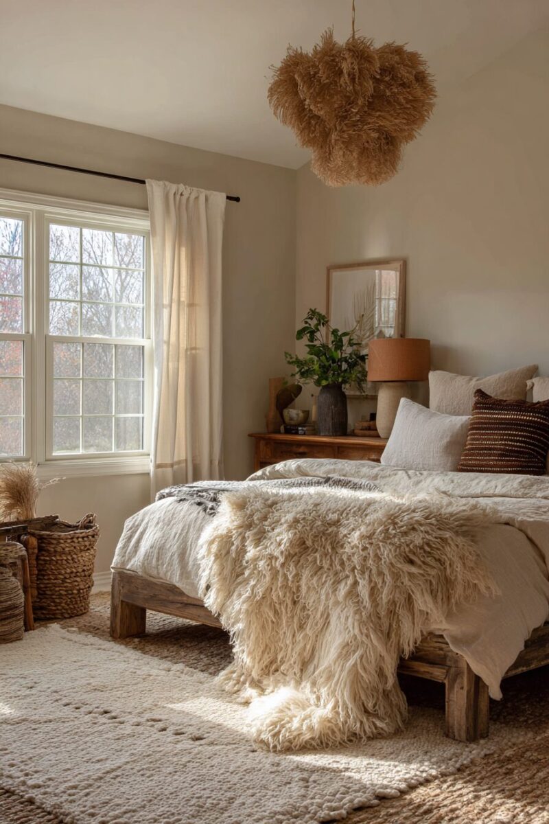 Cream and off-white bedding provides a neutral foundation that allows your earth tones to shine without overwhelming the space.