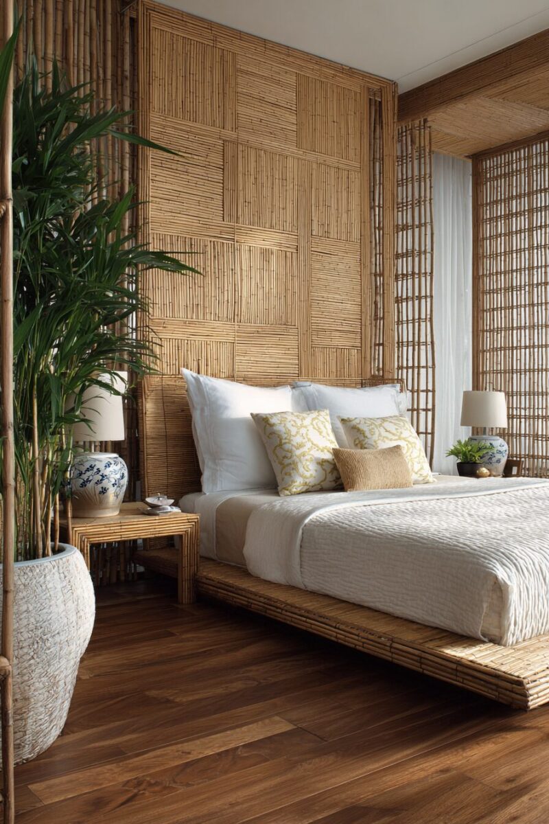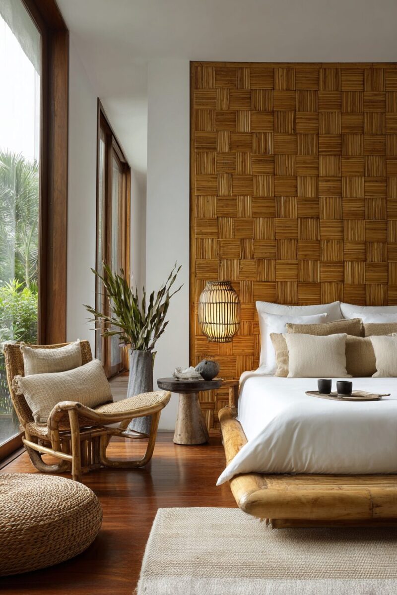 Bamboo and rattan furniture brings tropical serenity and sustainable style to your natural bedroom sanctuary.