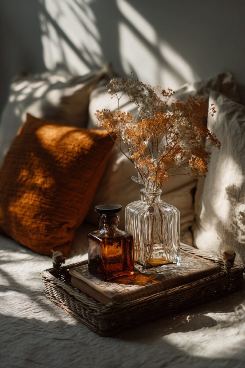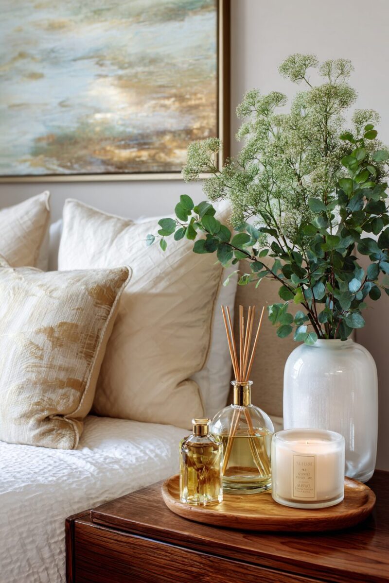 A dedicated aromatherapy corner transforms part of your bedroom into a spa-like retreat that signals your nervous system to unwind.