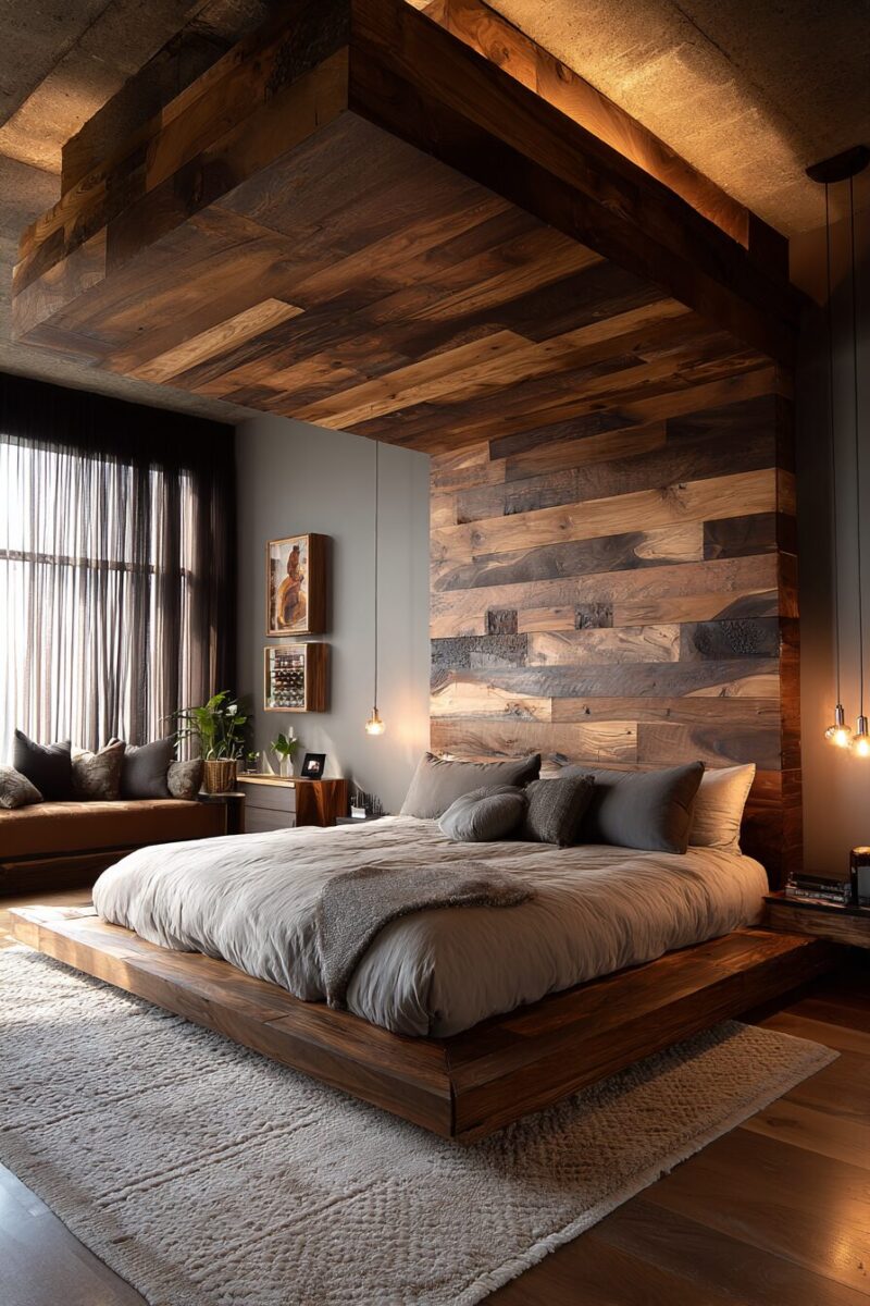 A reclaimed wood headboard becomes the stunning focal point that anchors your entire room design.