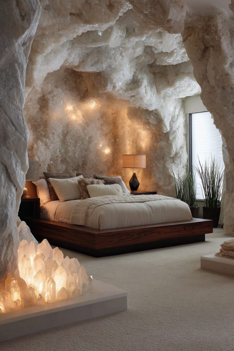 Large amethyst geodes serve as stunning natural sculptures while allegedly promoting peaceful sleep and reducing anxiety.