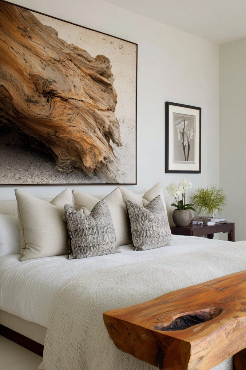 Add a wooden bench at the foot of your bed for seating and additional storage while maintaining the natural aesthetic.