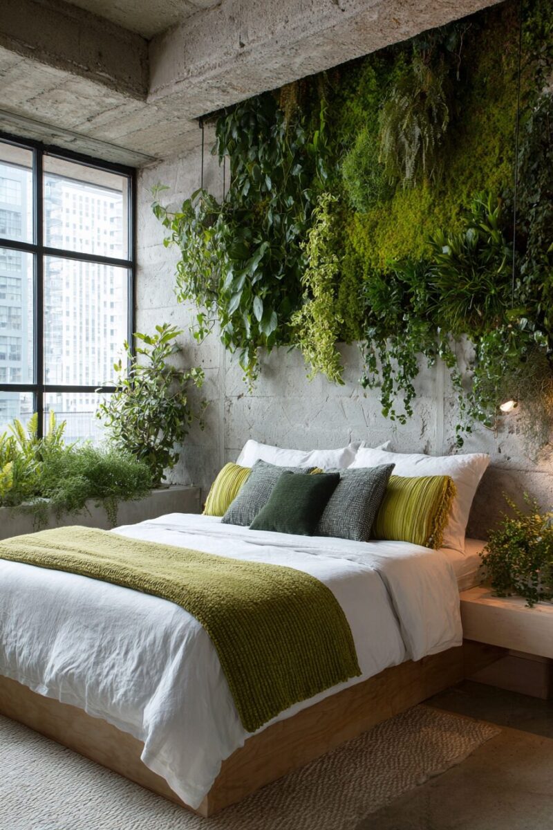 The layered greenery creates depth and visual interest while establishing your bedroom as a natural sanctuary.
