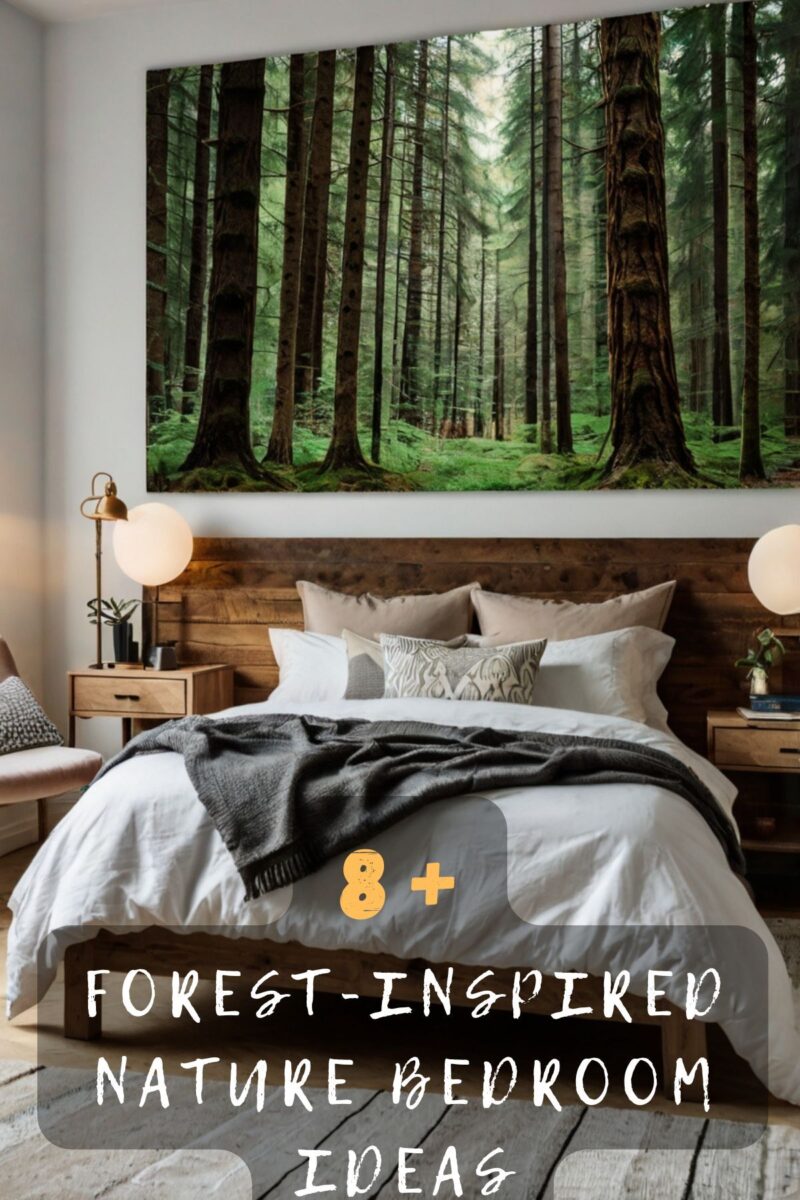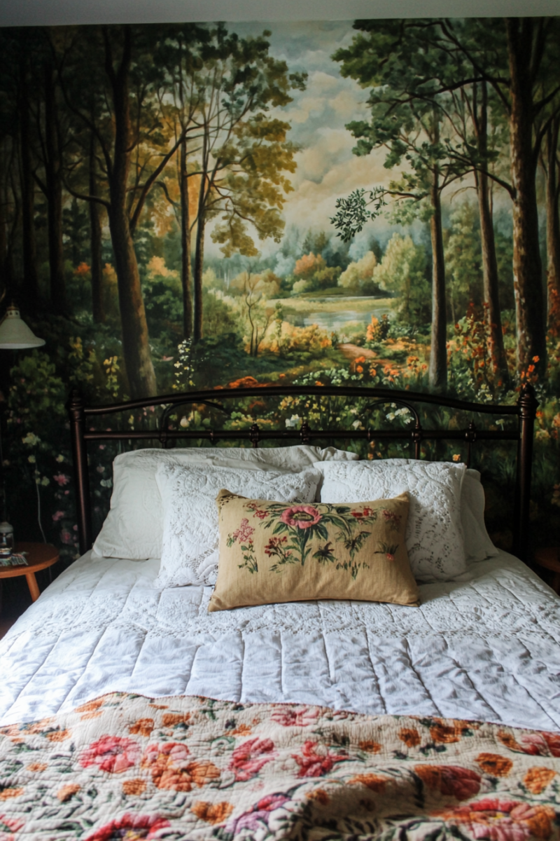 Forest mural bedroom – A large mural of an enchanted forest covers the entire wall behind the bed