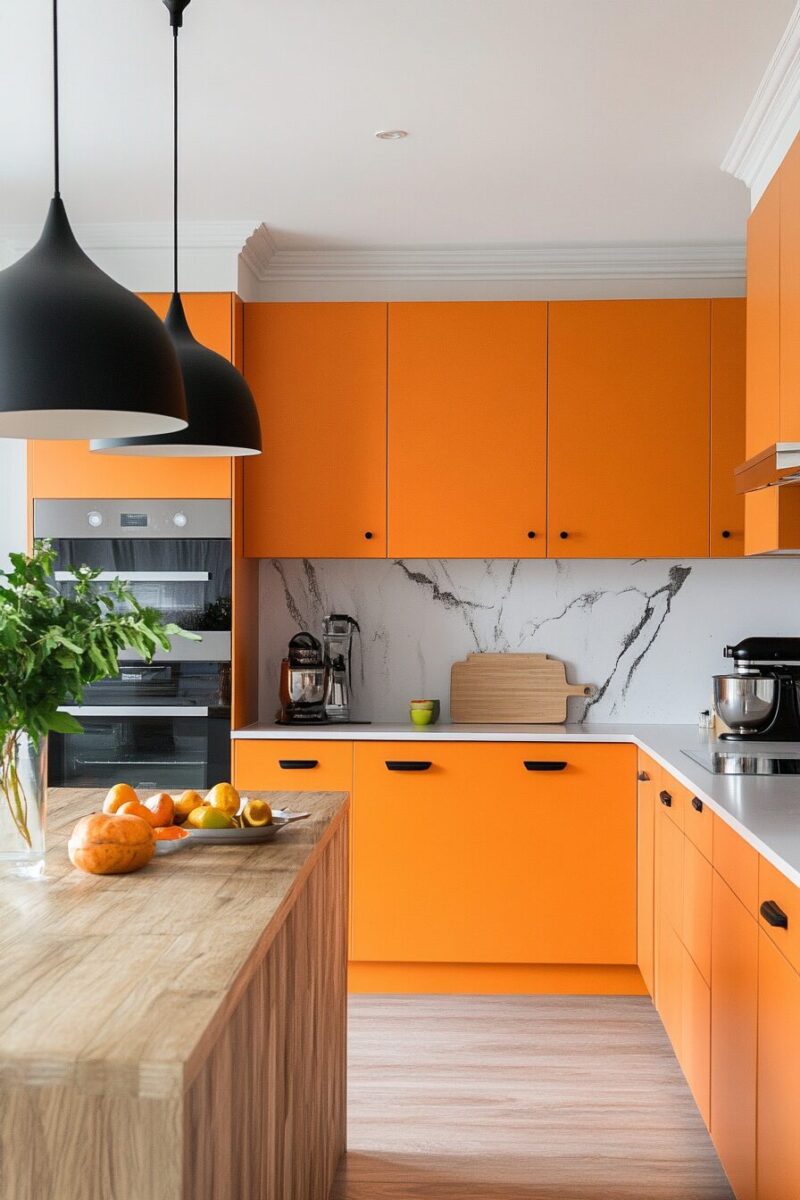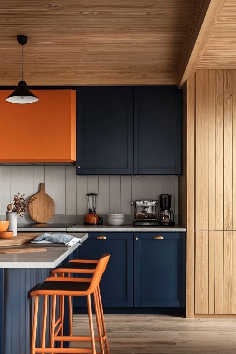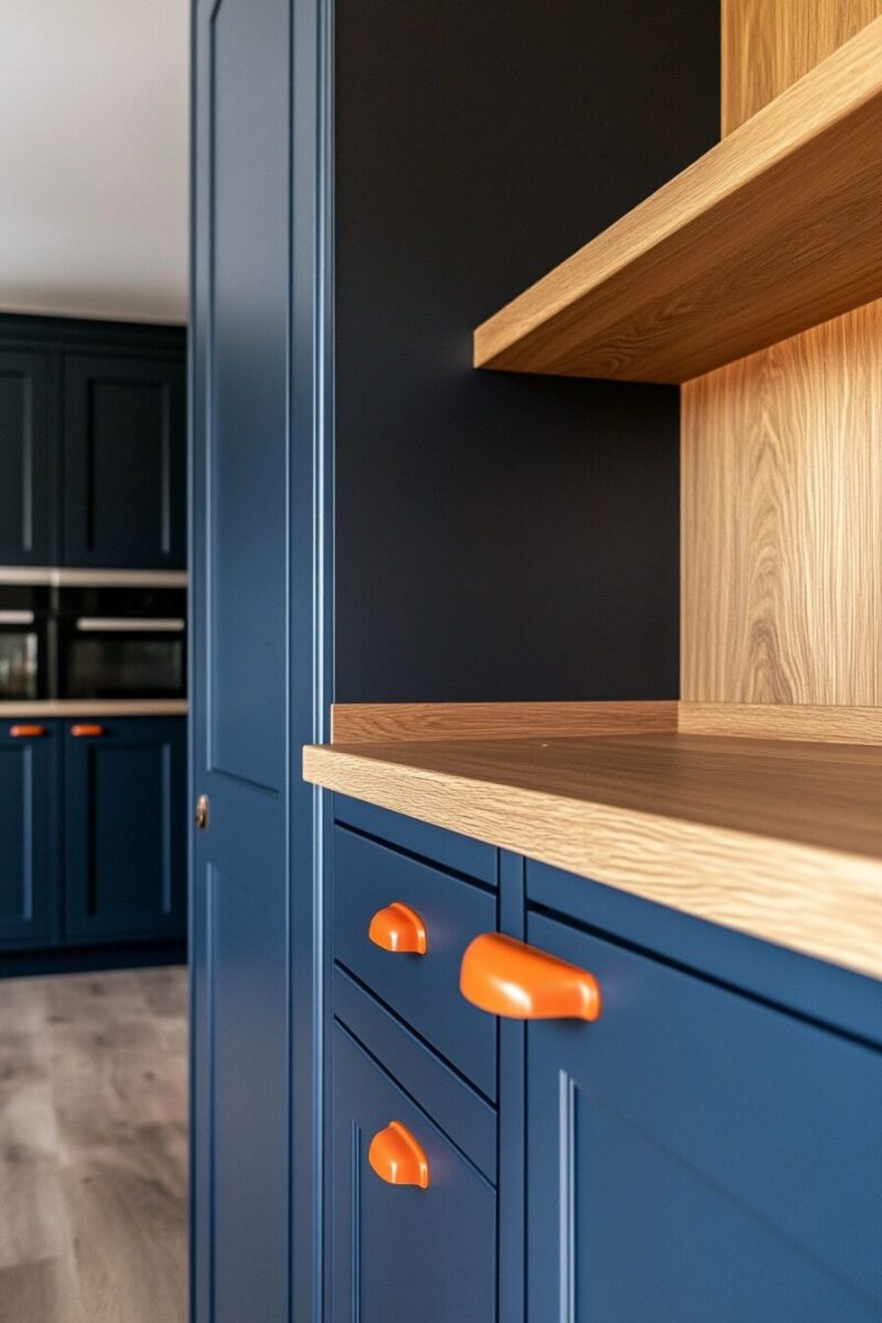 The dramatic transformation from orange to navy is especially striking in kitchens with white walls or countertops, creating a tailored, custom appearance.