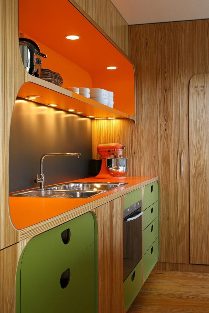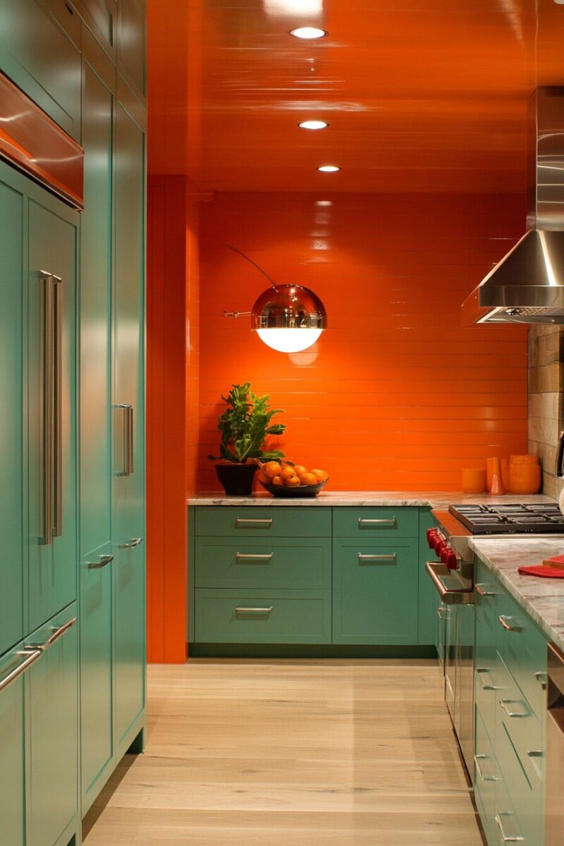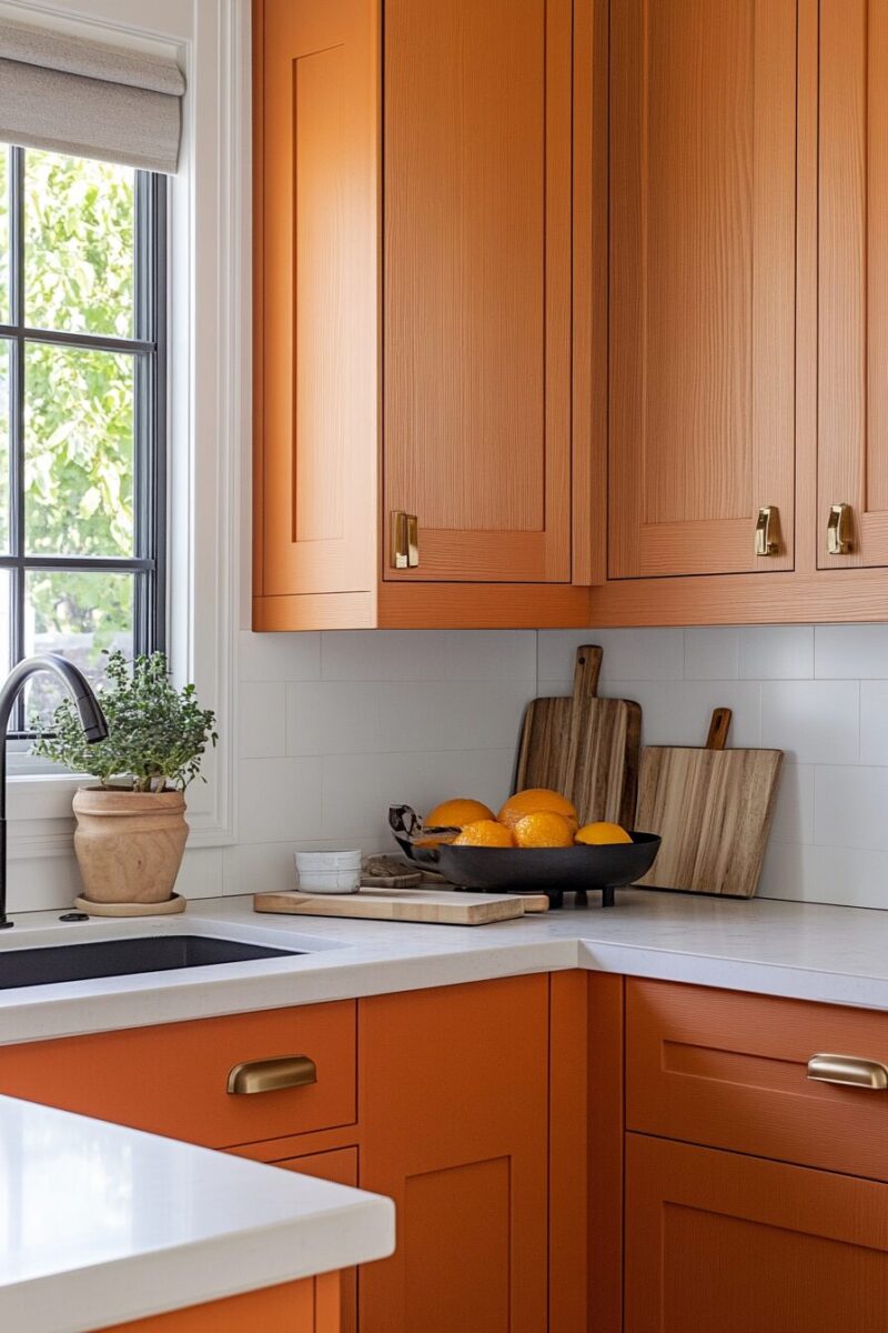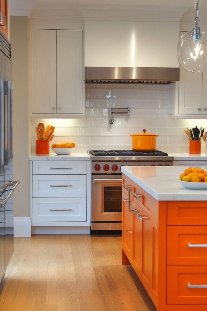 The dramatic transformation from orange to navy is especially striking in kitchens with white walls or countertops, creating a tailored, custom appearance.