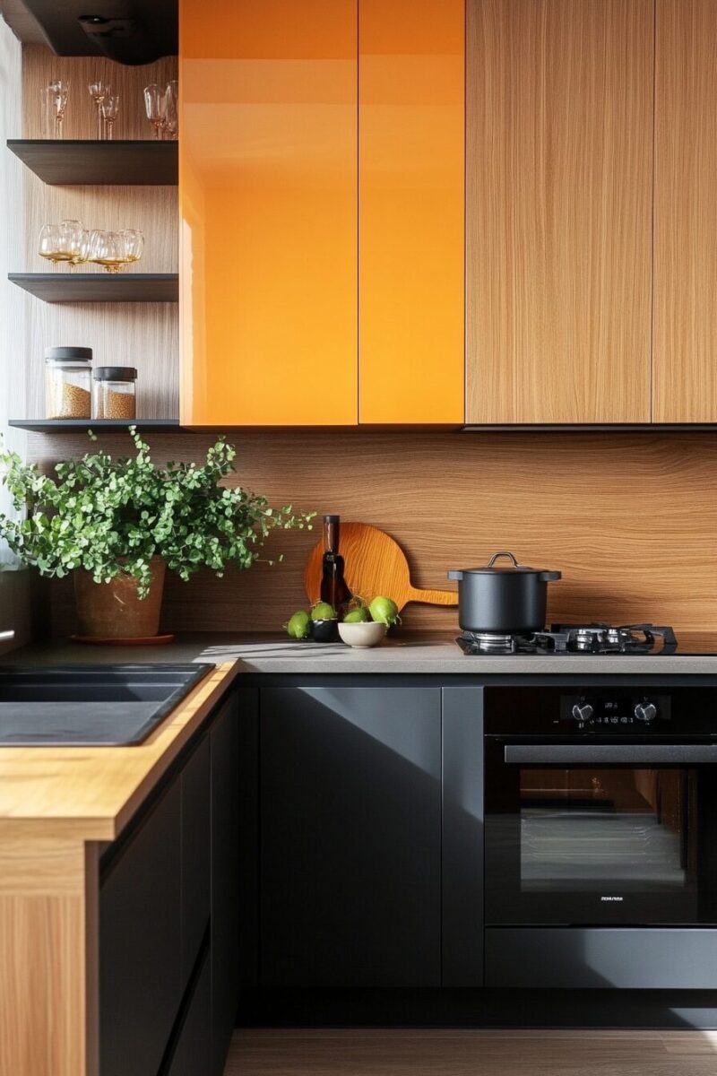 Modern matte black pulls create striking contrast against orange oak, instantly adding contemporary edge to traditional cabinetry.