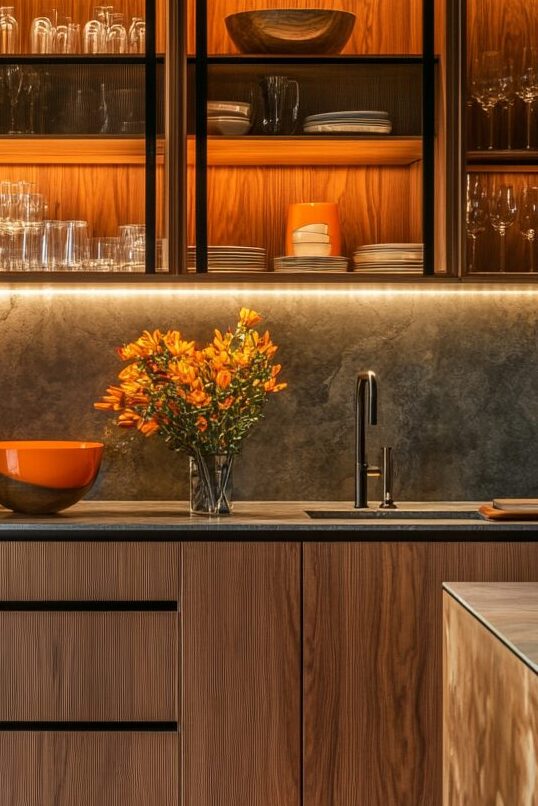 Strategic lighting installed inside these cabinets creates beautiful evening ambiance, highlighting special dishes or glassware.