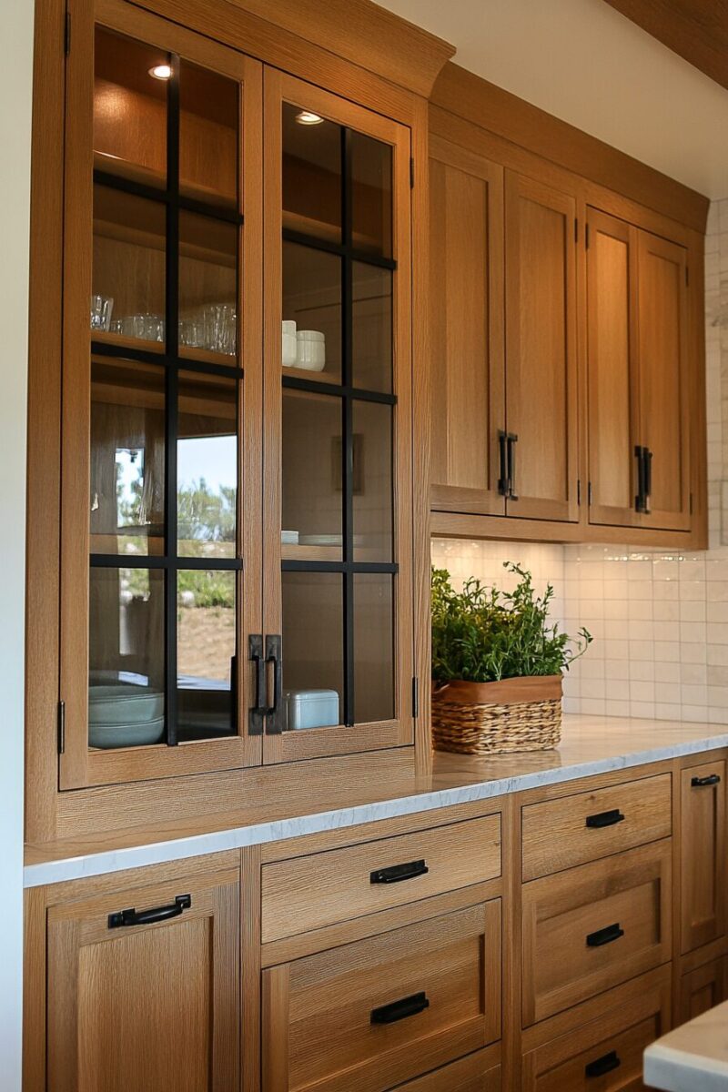 The combination of wood framework with glass inserts creates architectural interest that elevates the entire kitchen.