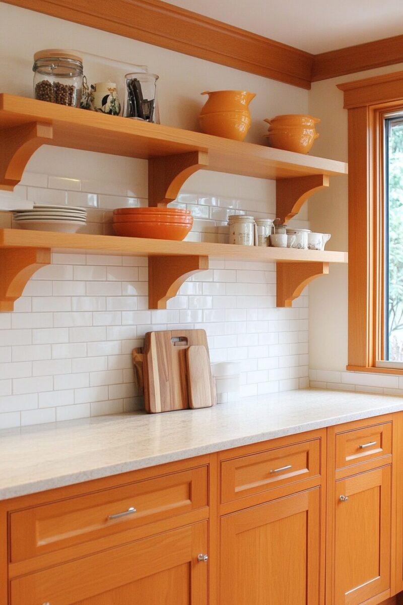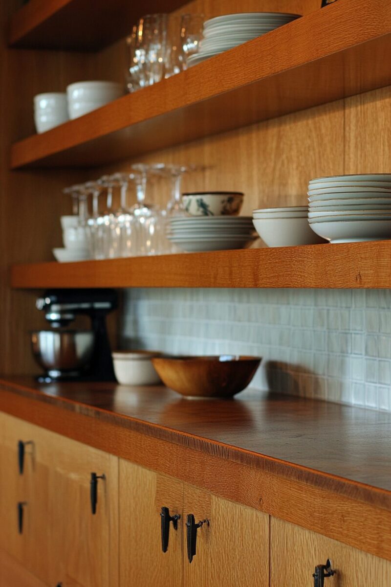 The contrast between open and closed storage creates visual rhythm that makes your kitchen feel intentionally designed rather than dated.