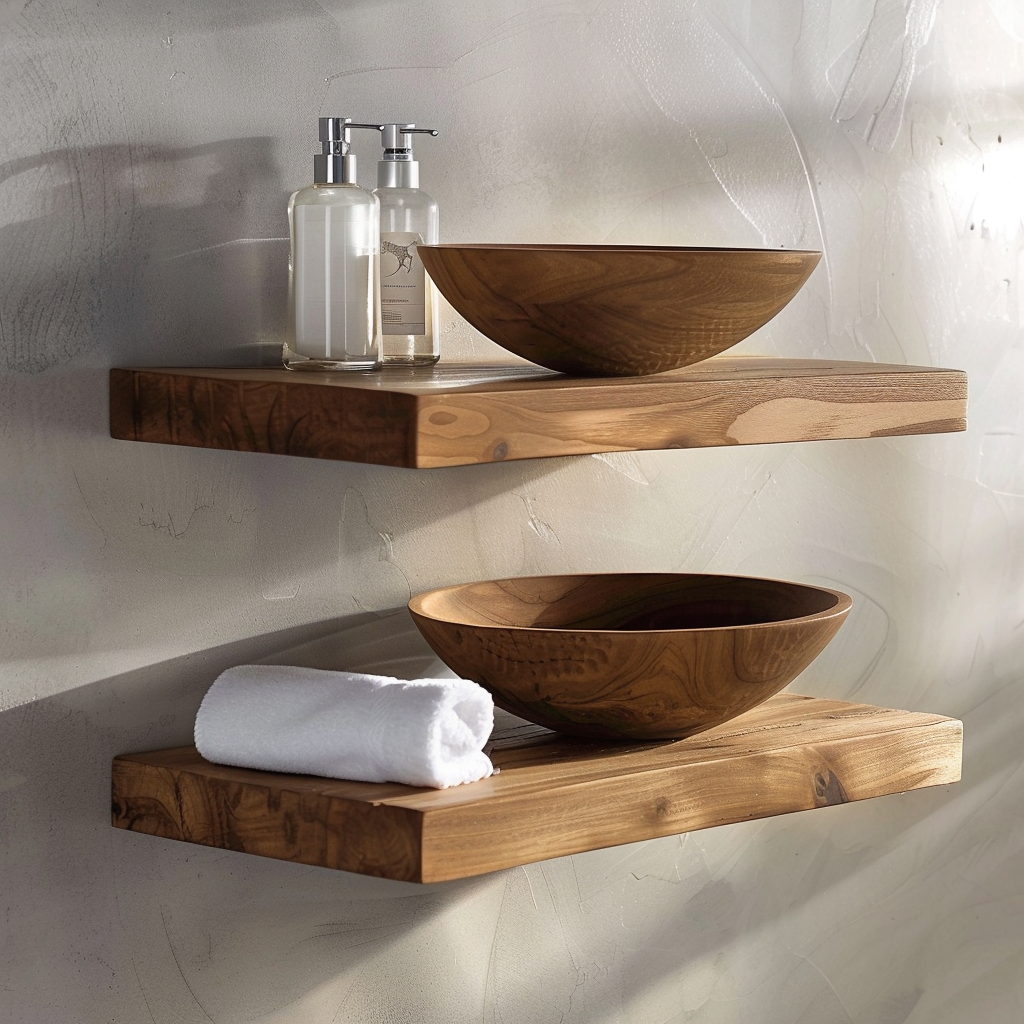 Place the wood shelves in various asymmetric configurations and heights on the wall above the vanity or tub.