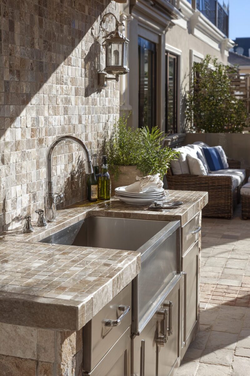 Install a small mirror above the sink area to create the feeling of a complete outdoor kitchen space.
