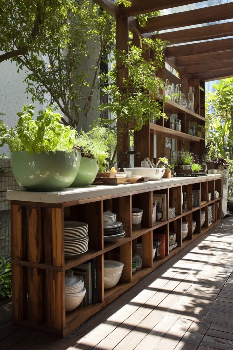 Effective storage transforms chaotic outdoor kitchens into organized, efficient cooking spaces using materials that might otherwise become waste.