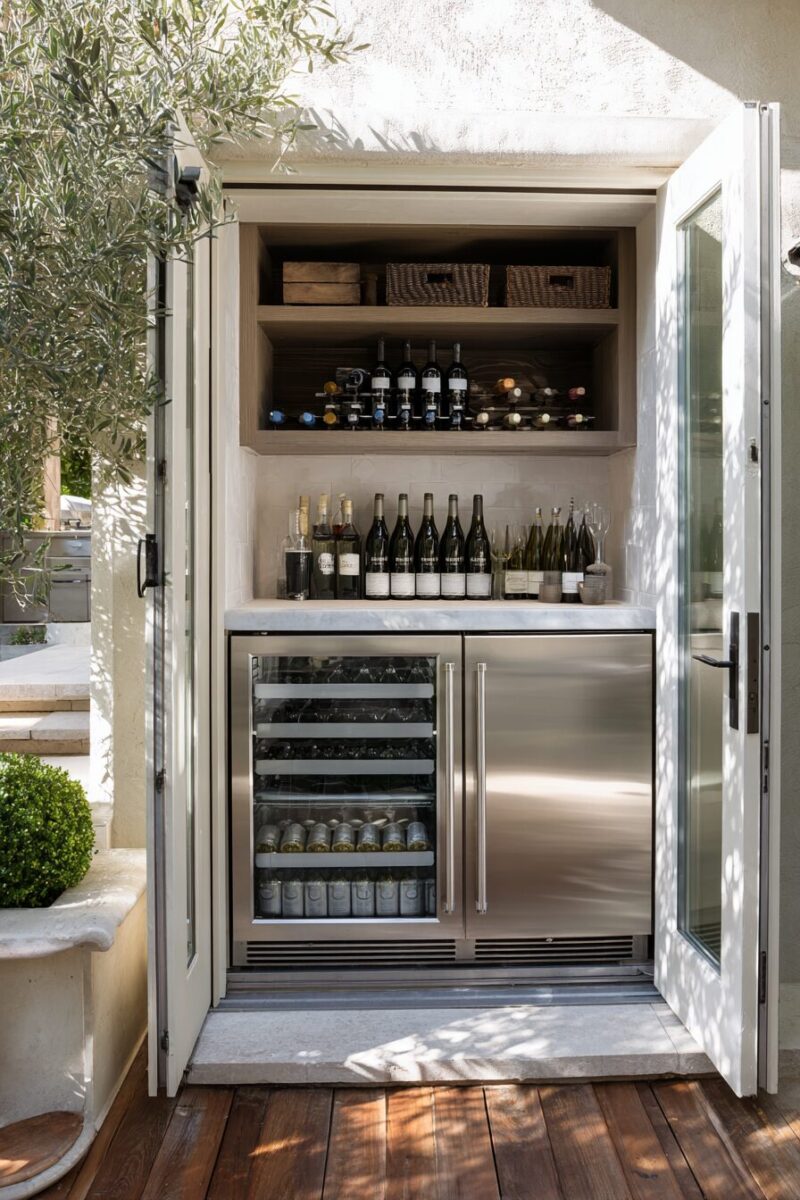 Include a small trash bin that fits inside the cabinet to keep waste contained and your outdoor space tidy.