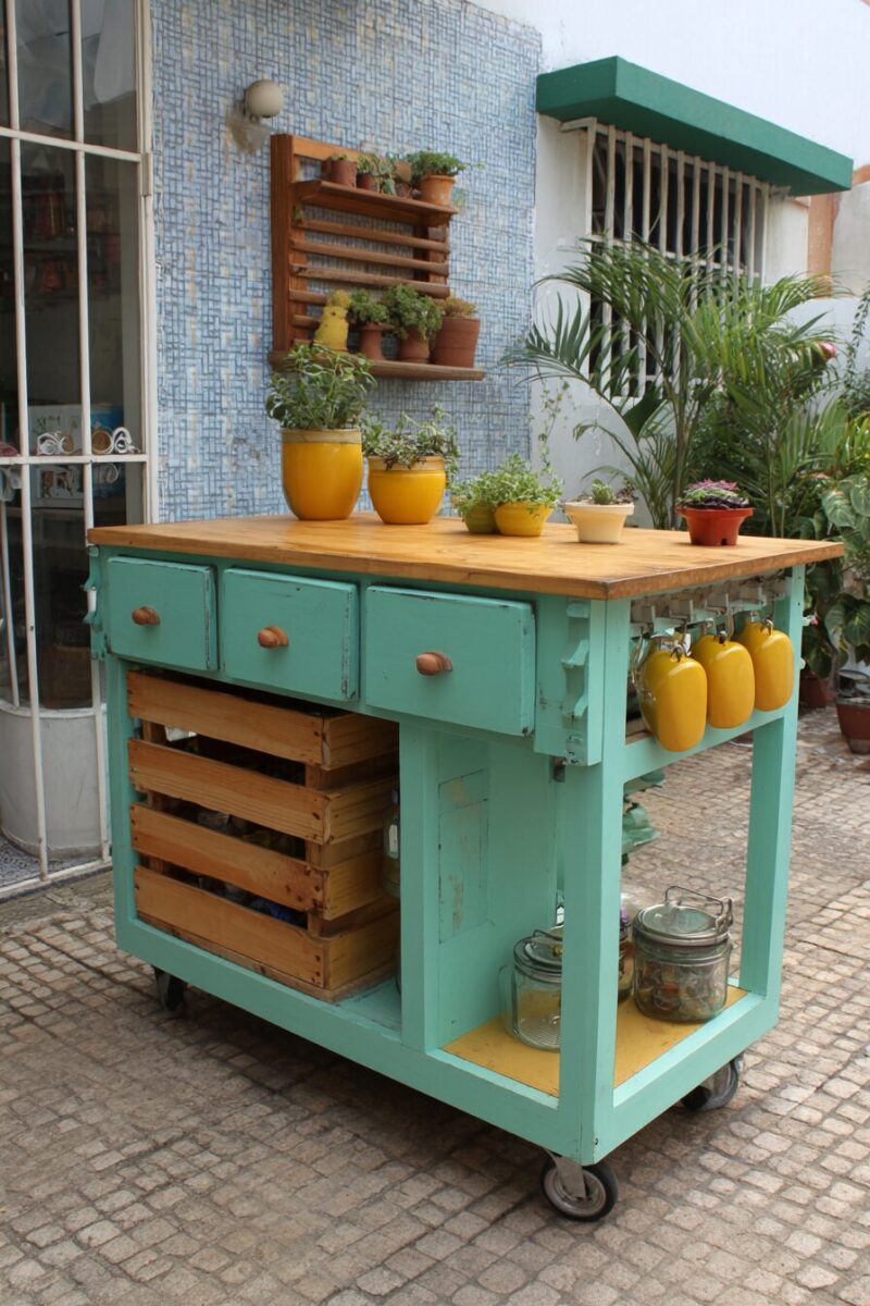 An old dresser can become a fully functional mobile kitchen island with storage, prep space, and vintage charm.