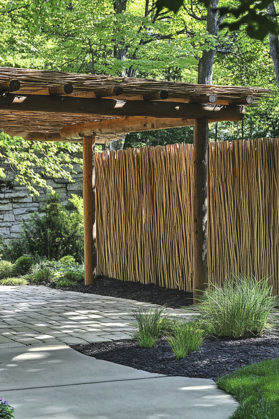 To add a decorative touch to your bamboo privacy screen, consider weaving colorful fabric strips, attaching small lanterns, or stringing delicate fairy lights through the bamboo poles, creating a warm, inviting ambiance that glows softly in the evening hours.