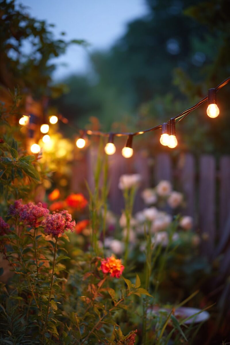 Create magical pathways by combining string lights with low-growing border plants like lavender or boxwood that define garden walkways.
