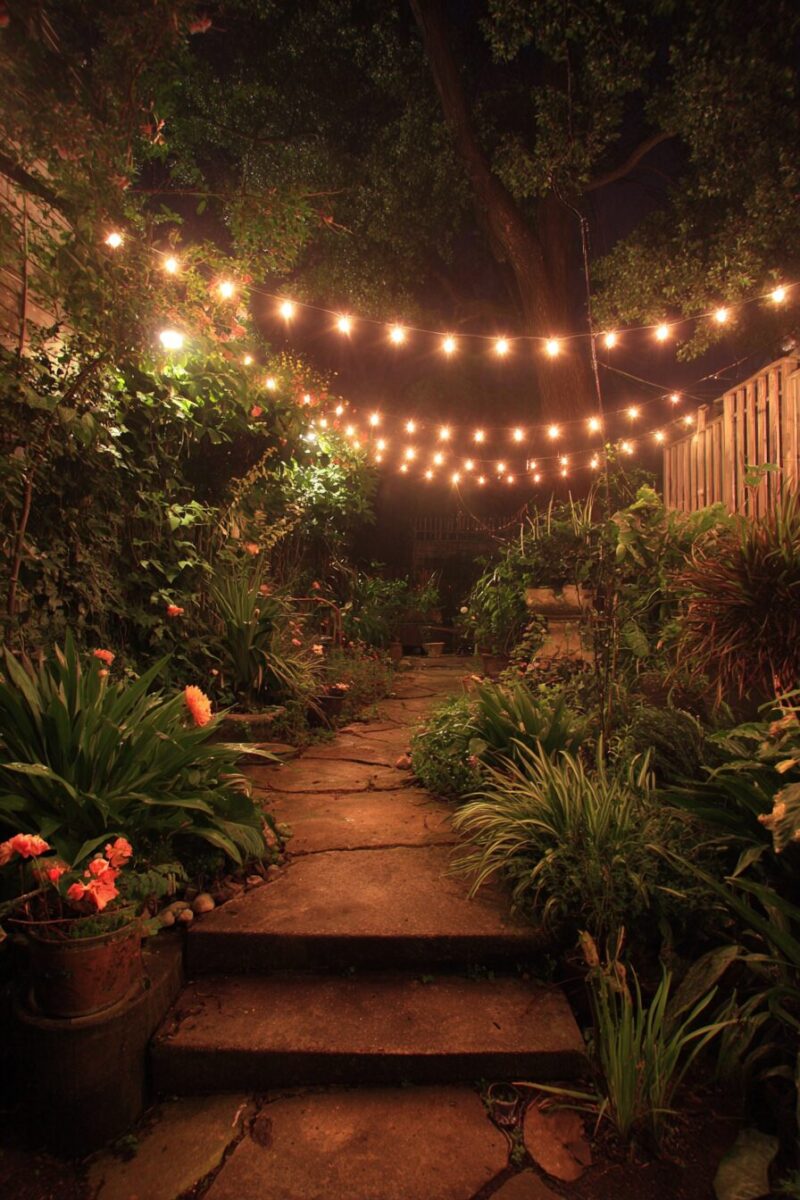 Transform ordinary walkways into enchanting journeys through your landscape with strategically placed string lighting that guides and delights.