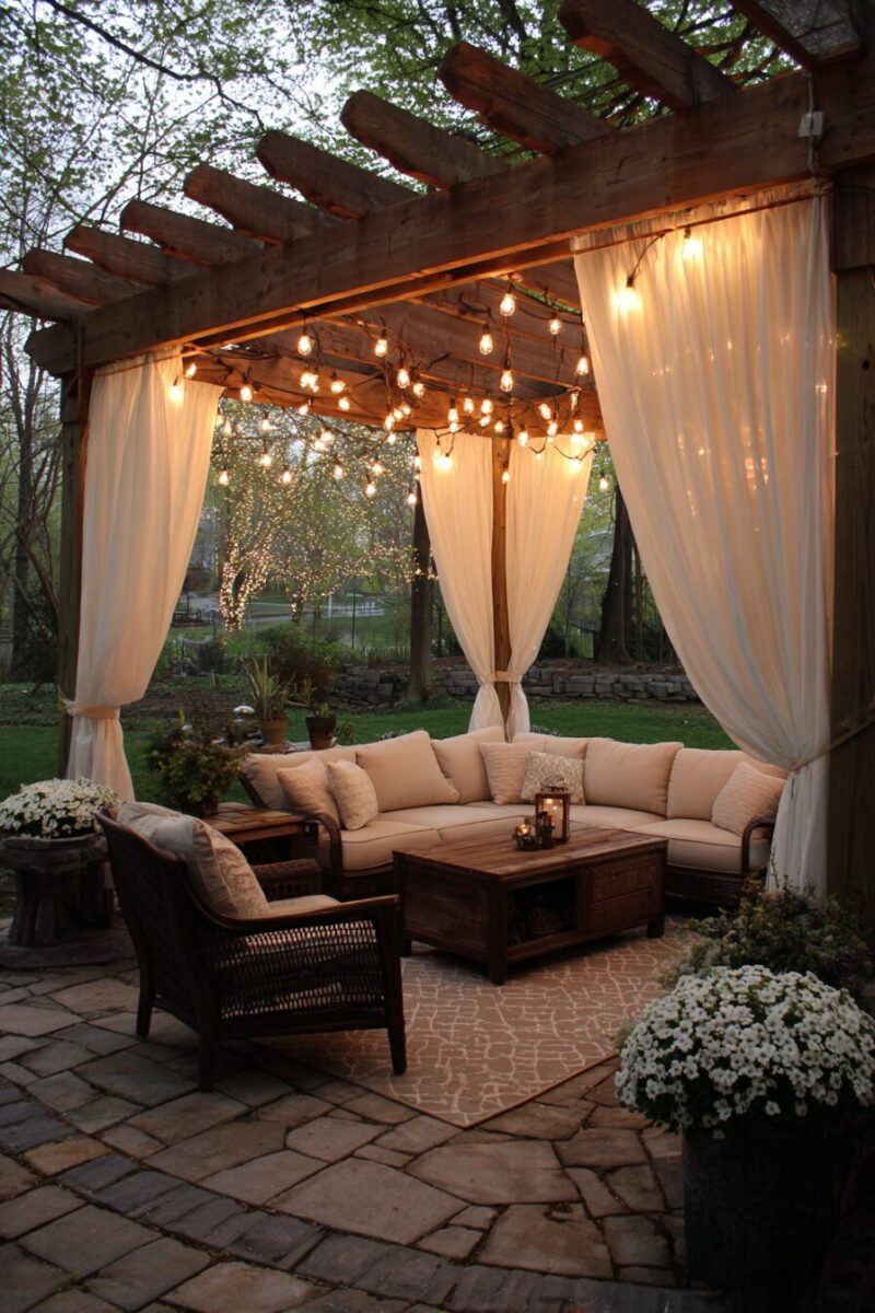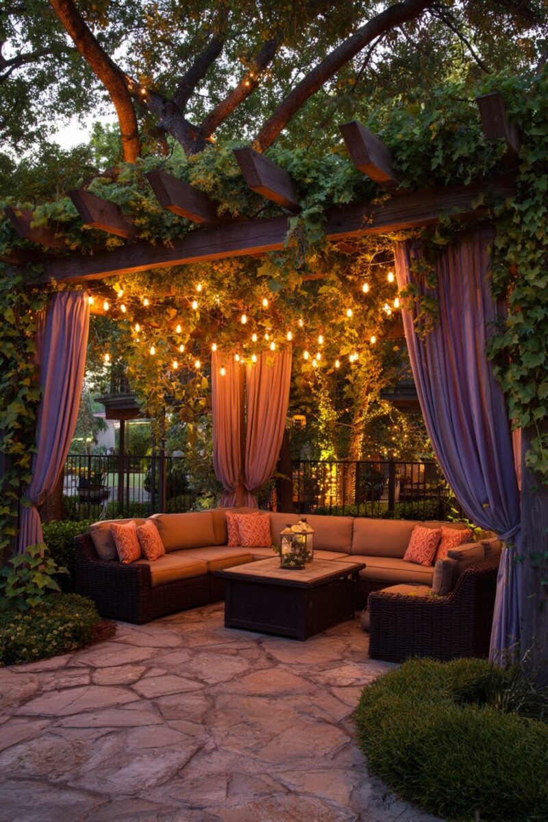 For romantic ambiance, intertwine delicate fairy lights with climbing plants like jasmine or wisteria that grow on your pergola.