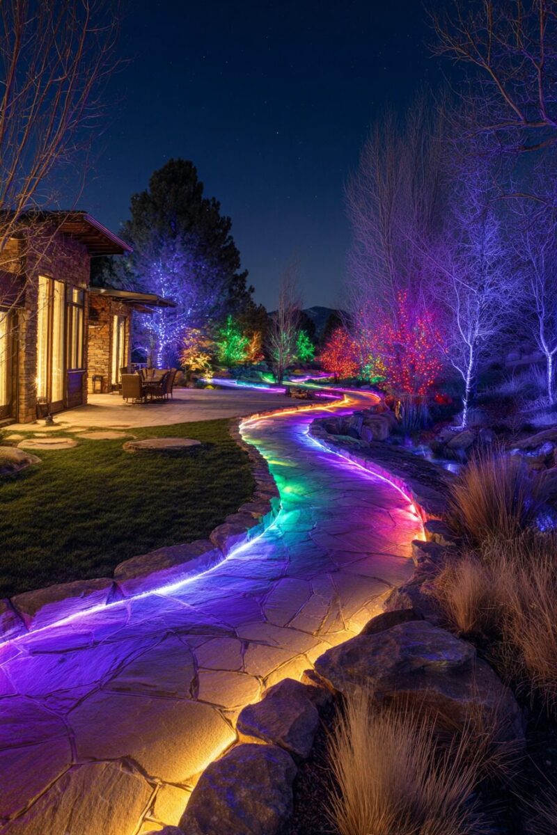 Water features like fountains or pools take on magical qualities when illuminated with color-changing lights that reflect and dance on the surface.