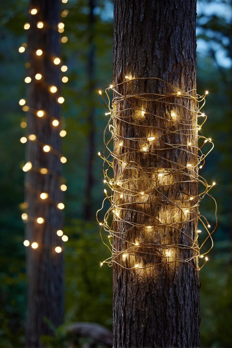 The vertical illumination from tree wrapping balances perfectly with horizontal lighting elements like pathway lights or fence decorations.