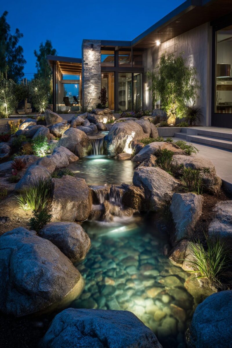 Water features take on new life after dark when properly lit, becoming focal points that add movement, sound, and visual interest to your nighttime landscape.