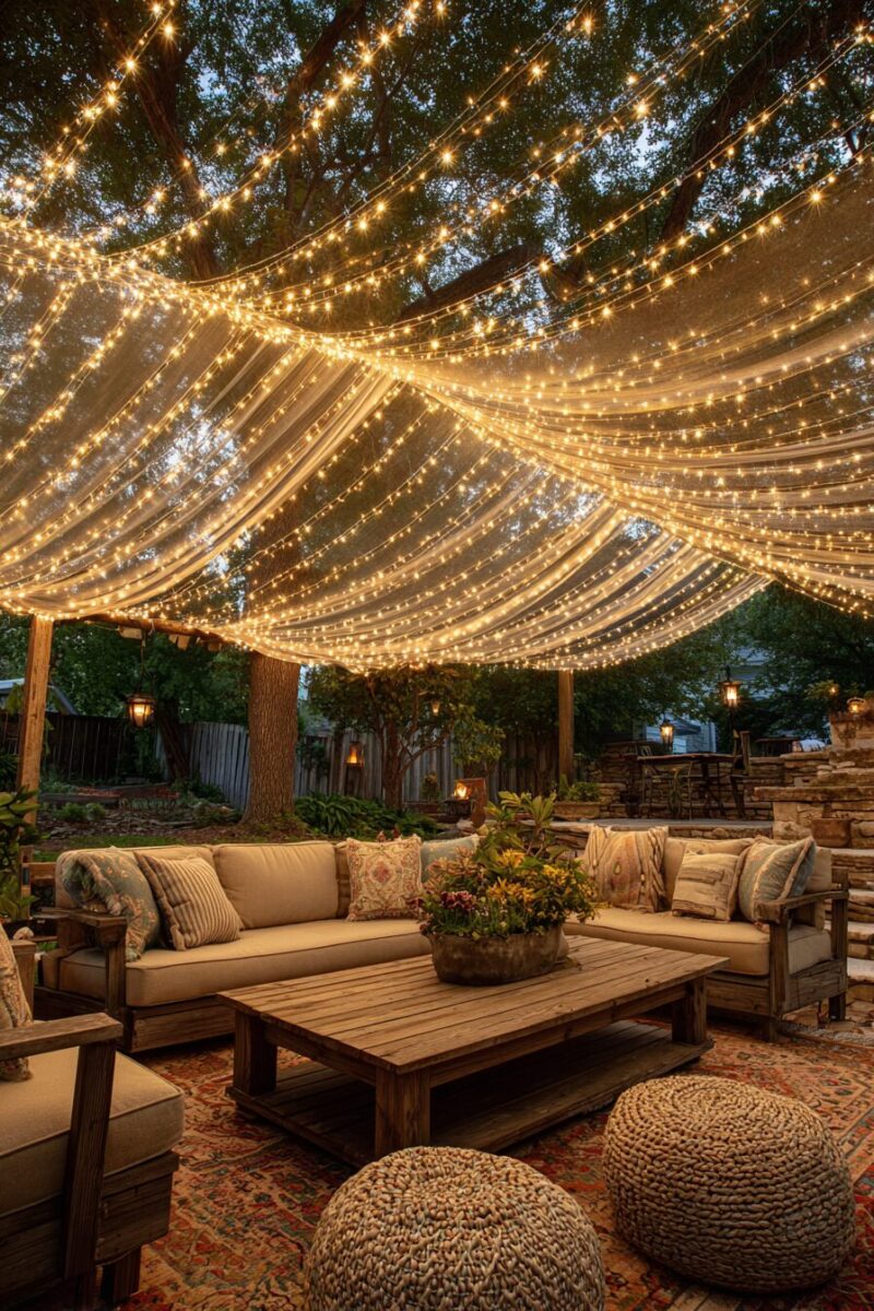 Creating a twinkling ceiling of lights above your outdoor space instantly transforms it into a magical wonderland.