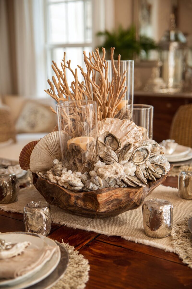 Your dining table is about to become the envy of every home decor magazine with centerpieces that showcase oyster shells in all their natural glory.