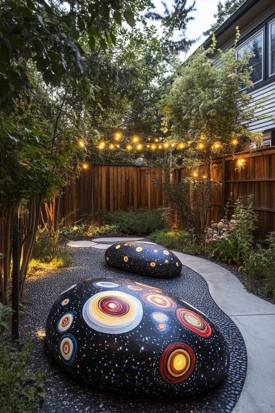 For maximum impact, create a winding pathway of galaxy rocks that guide visitors through darker areas of your yard, providing both practical lighting and whimsical decoration.