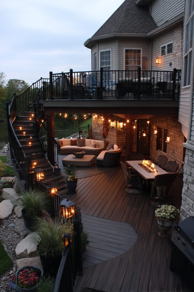 Strategic lighting between levels adds another layer of sophistication, turning your deck into a glowing beacon that draws people outside even after sunset.