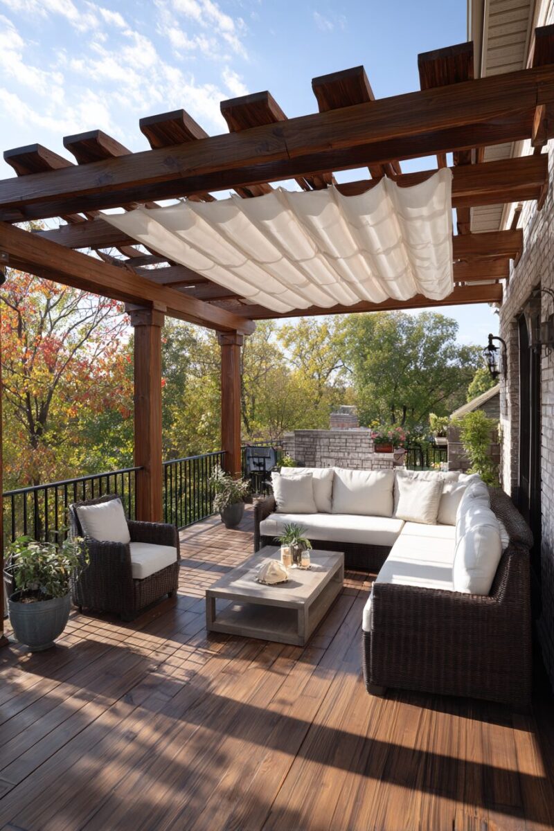 You can design the pergola structure using rich wood tones like cedar or teak for a natural look, or opt for sleek aluminum framing for a more contemporary aesthetic.
