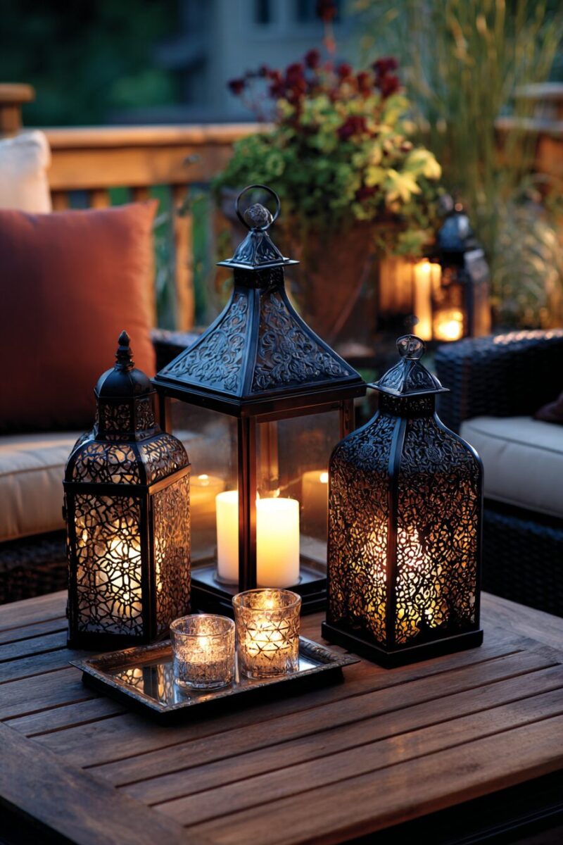 Moroccan-inspired metal lanterns cast intricate shadow patterns when lit from within, essentially projecting art onto your patio surfaces and creating an exotic atmosphere that transports your guests to distant lands.