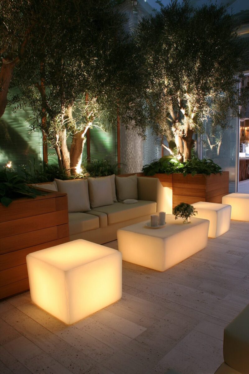 Illuminated planters combine greenery with glowing bases, highlighting your botanical choices while providing substantial ambient light that softly washes across your patio floor.