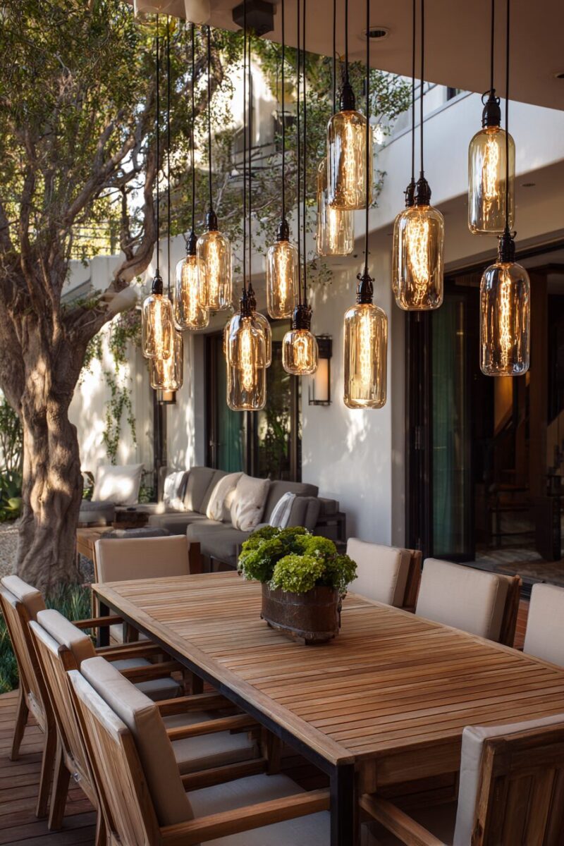 Oversized industrial pendants suspended over dining areas create immersive pools of light that define spaces within your larger patio, essentially creating rooms without walls under the open sky.