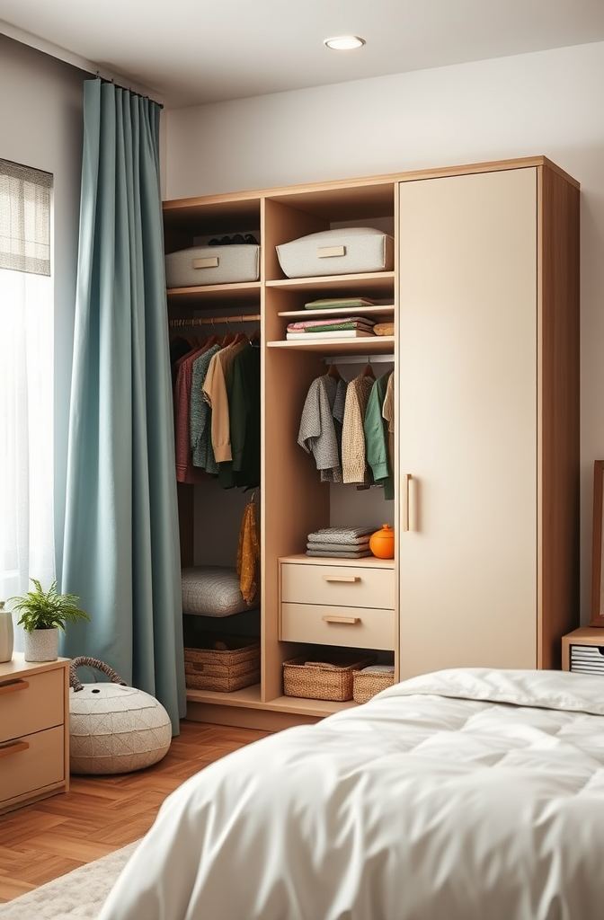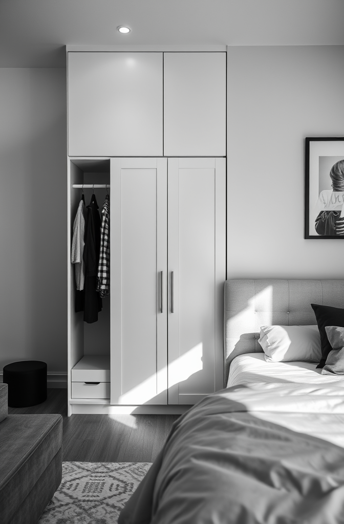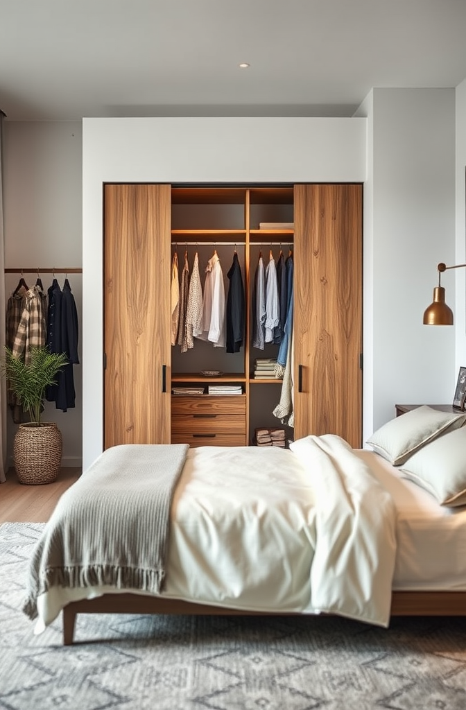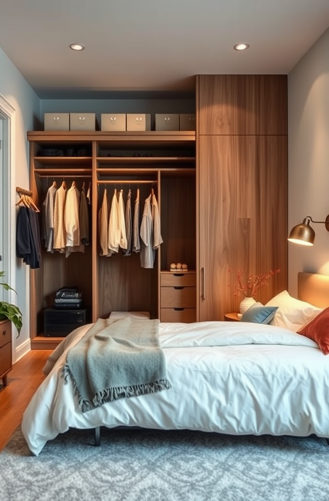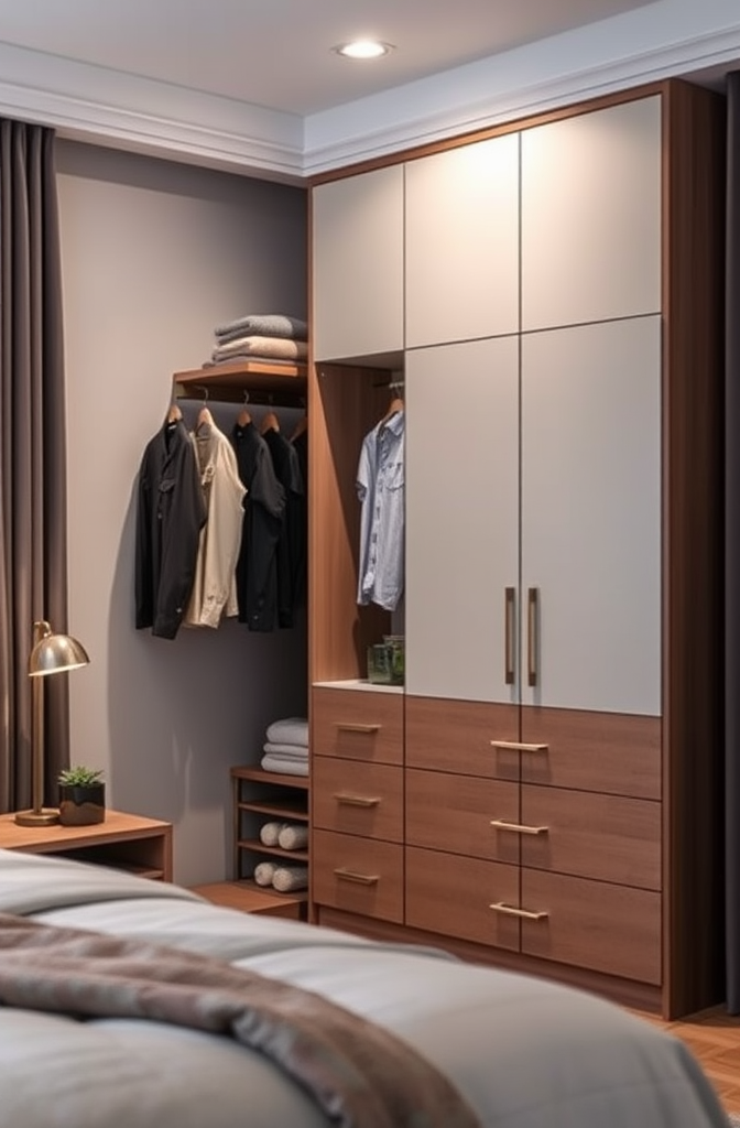 The freestanding room divider approach works brilliantly in studio apartments, lofts, or even large bedrooms where you want to create a dressing area separate from the sleeping space.