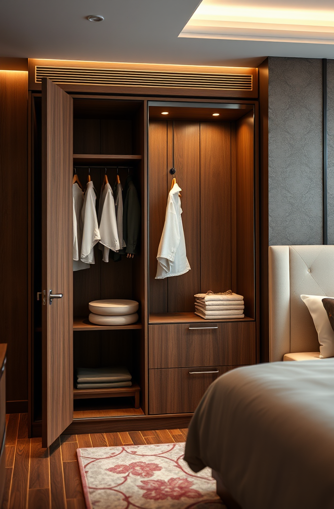In true hotel style, consider adding a fragrance element – a small diffuser hidden on a top shelf ensures that opening your wardrobe becomes a multi-sensory experience.