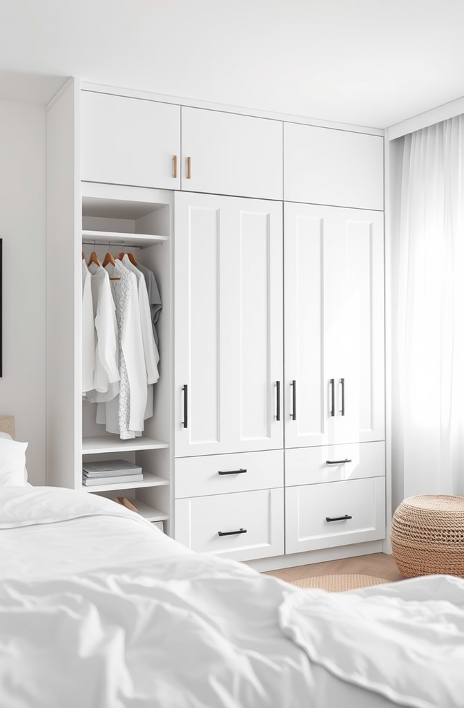 If you’re worried about too much white feeling cold, introduce warmth with natural woven baskets on the shelves or display a few colorful accessories on an open section.
