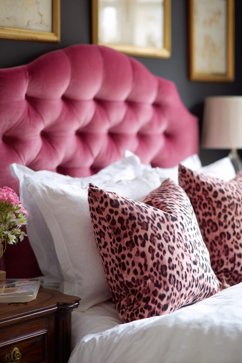 Pink Velvet Headboard with Cheetah Print Throw Pillows