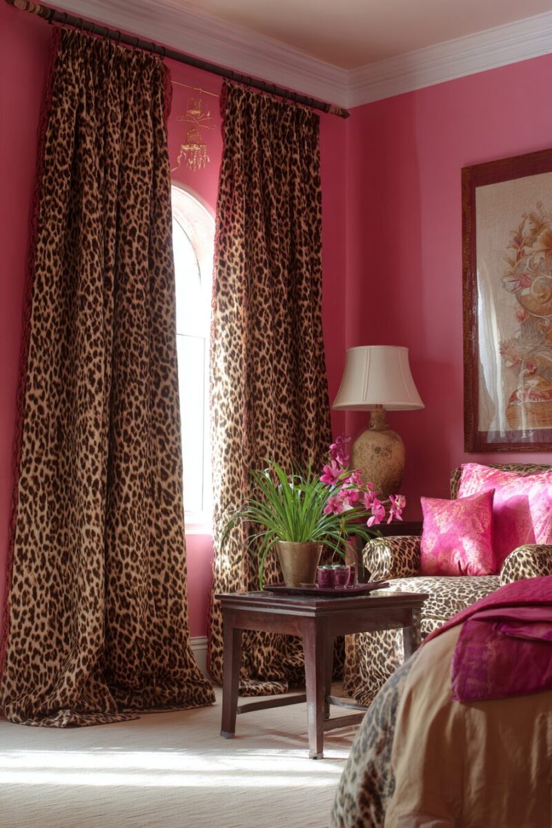 The magic happens when you select cheetah print curtains that pick up the subtle undertones in your pink walls, creating a harmonious color story throughout the room.